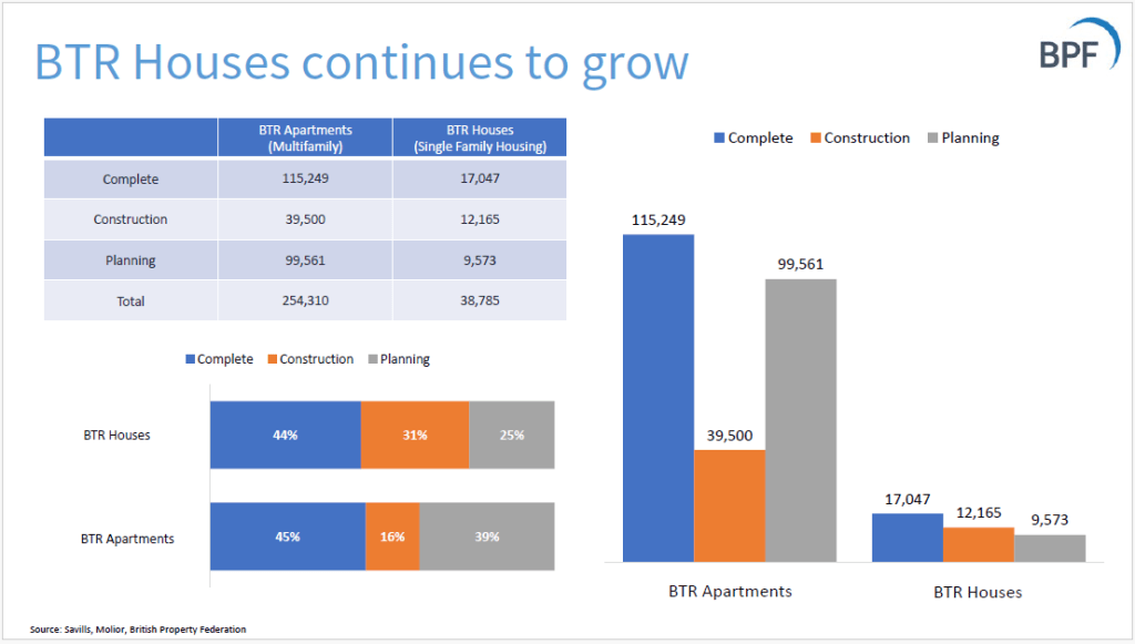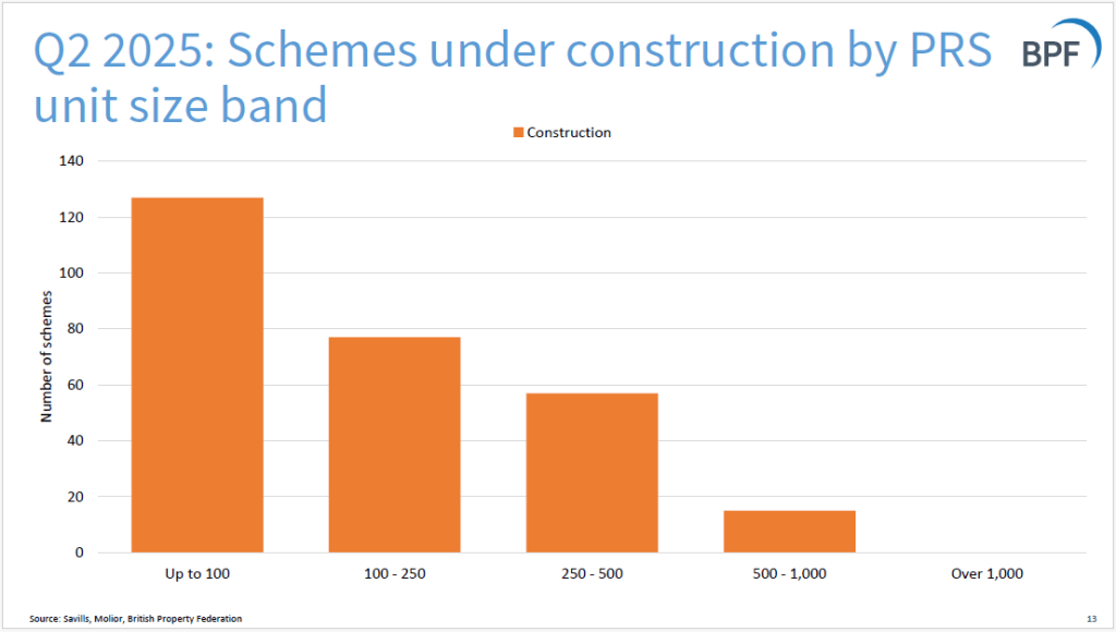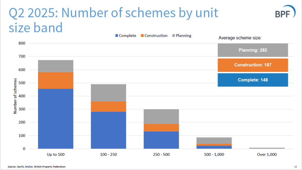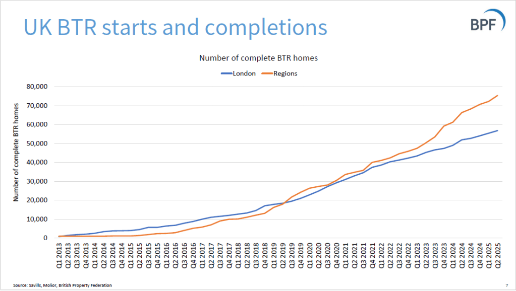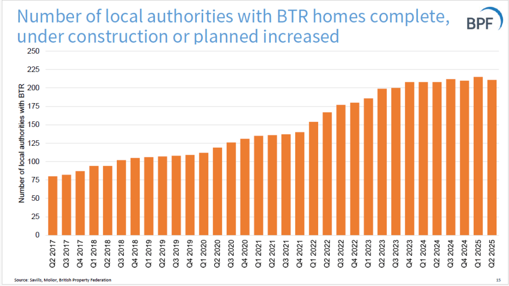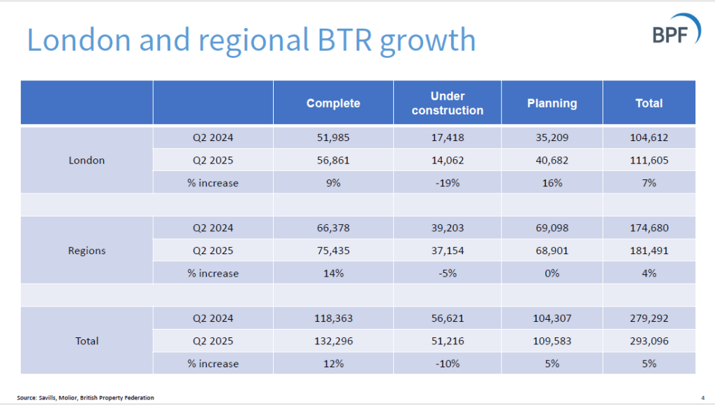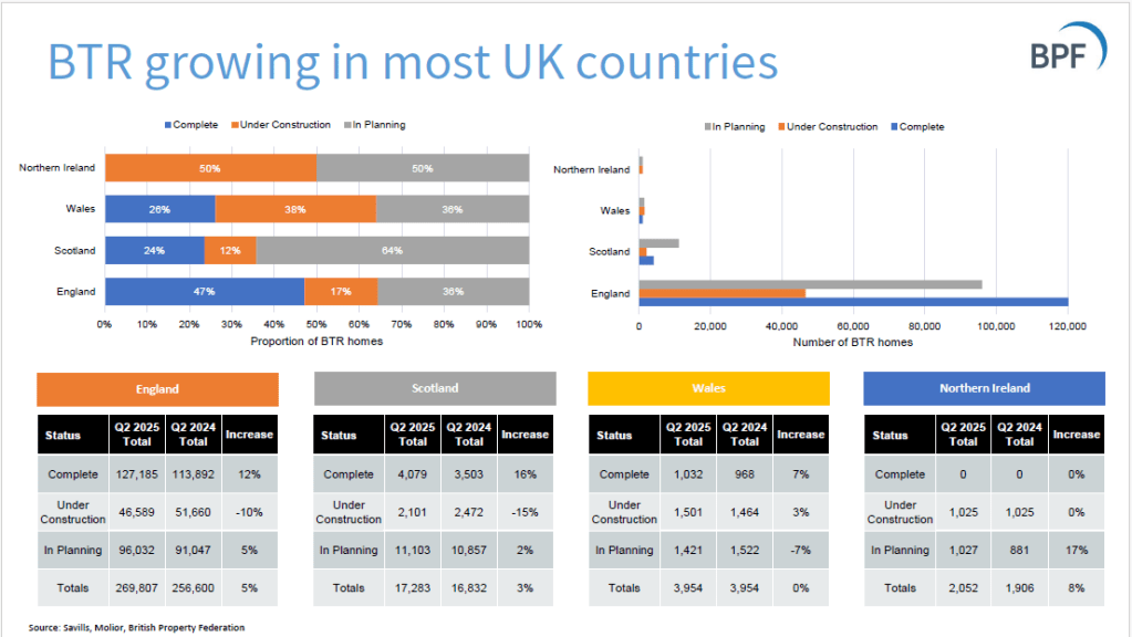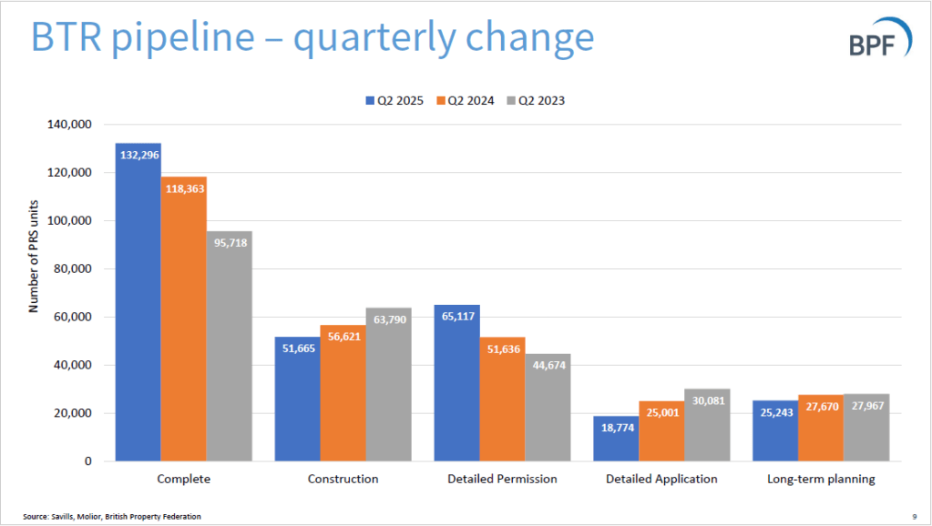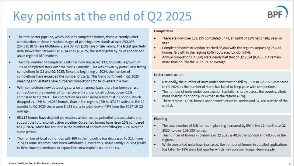 The BPF publishes quarterly statistics on Build-to-Rent, produced by Savills. The statistics focus on quarterly growth in the number of projects that are in planning phase or have been completed. From the Q2 2025 stats:
